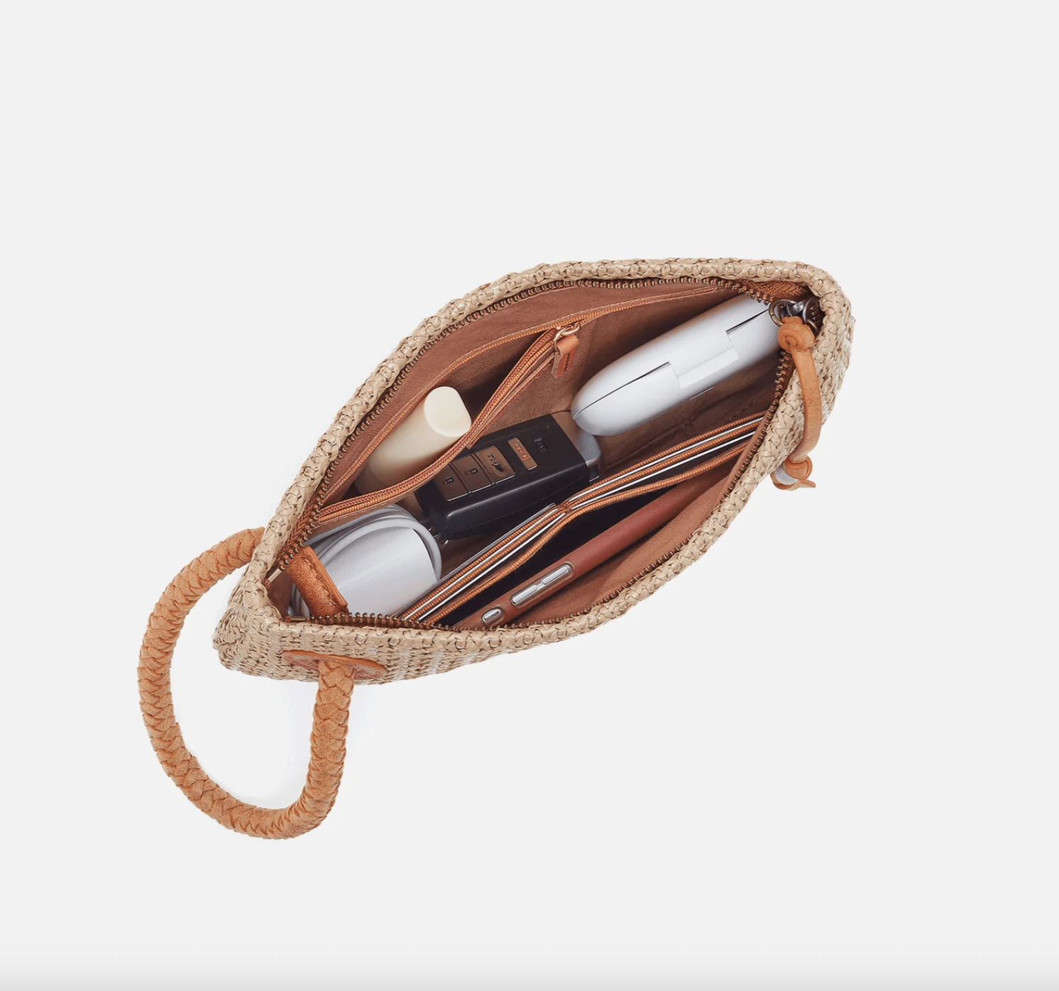 - Outside pockets include: front slip pocket, back zip pocket